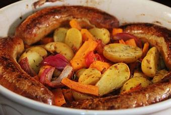 Bratwürste herausnehmen und mit dem Gemüse in eine Auflaufform geben. Im vorgeheizten Backofen bei 175° Grad Umluft für 25 – 30 Minuten backen.