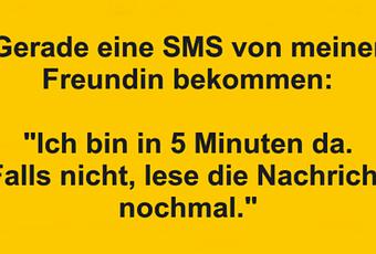 Auf Facebook teilen Vorige Folgende Gerade eine SMS von meiner Freundin bekommen:... Autor des Artikels : istdaslustig Zum Original-Artikel Gerade eine SMS von meiner Freundin bekommen: "Ich bin in 5 Minuten da. Falls nicht, lese die Nachricht nochmal." Hier geht es zum Artikel Mehr Lustiges auf www.istdaslustig.de Auf Facebook teilen Vorige Folgende Das könnte Ihnen gefallen Mehr