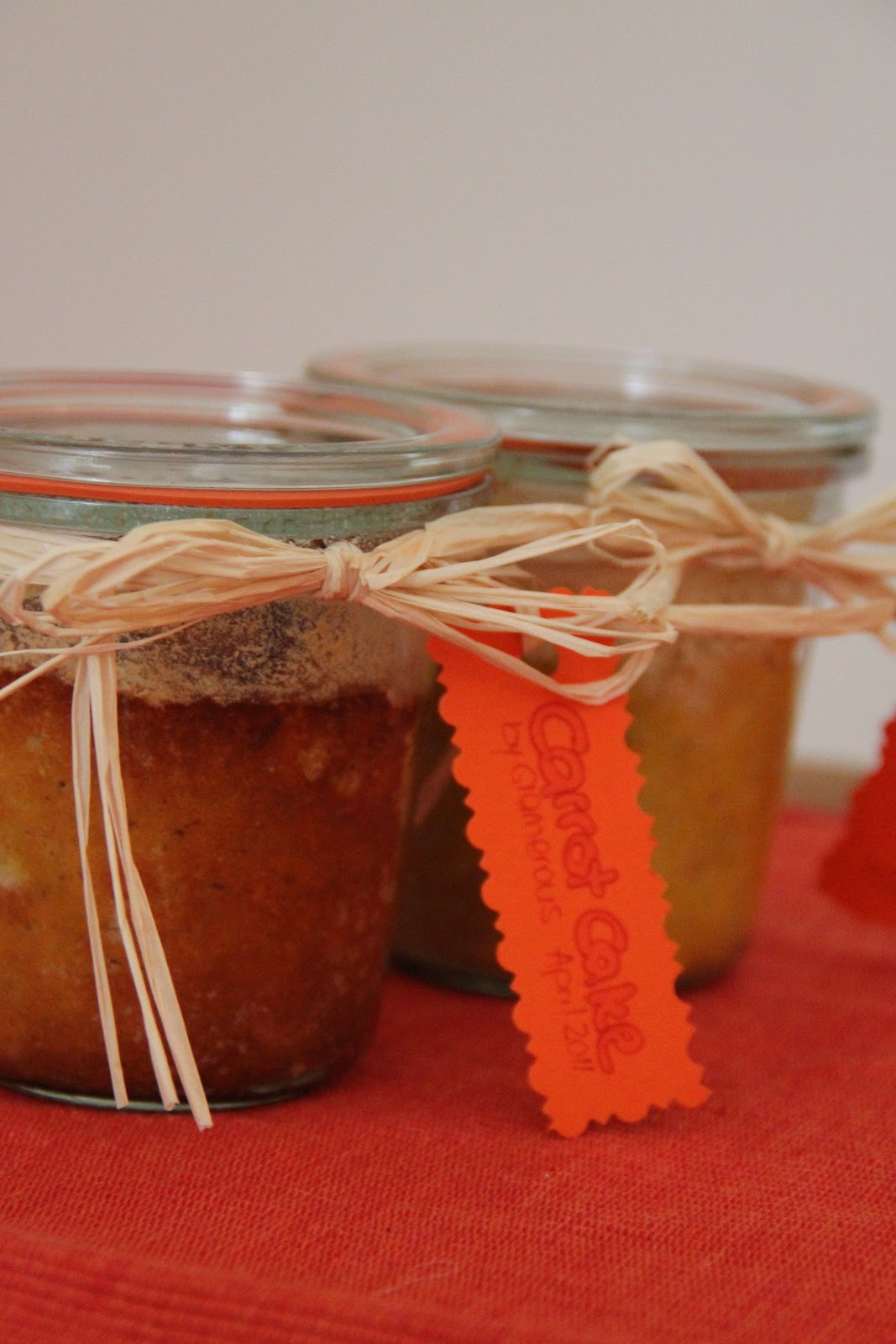 Zubereitung:Die Einmachgummis der Gläser in kaltem Wasser einweichen.Die Möhren fein raspeln. Gläser mit Butter einfetten und mit Paniermehl panieren. Den Backofen auf 175 °C vorheizen.Eier trennen und Eiweiss mit einer Prise Salz steif schlagen.Eigelb und Zucker schaumig zu einer dickflüssigen Masse schlagen. Restliche Zutaten dazu geben und zum Schluss das Eiweiss vorsichtig unterheben. Teig zu 2/3 in die Gläser füllen. Darauf achten, dass der Rand sauber und fettfrei bleibt!Den Rest des Teiges habe ich auf 12 Muffinförmchen verteilt.Die Muffins je nach Ofen ca. 25 min. und die Gläser ca. 35 min. backen. Am Besten immer mal wieder kontrollieren und den Stäbchen - Test machen.Wenn die Kuchen fertig sind, die Gläser mit den Einmachgummis belegen, Deckel drauf und die Klammern anbringen.Wenn die Kuchen abgekühlt sind können die Klammern entfernt werden. Die Gläser dürften jetzt Dicht sein und sind bis zu 6 Monate haltbar. Die werden sie aber wahrscheinlich nicht überleben. Ein Glas wurde bei uns schon gekillt. :)Auf die Muffins noch ein Topping aus Frischkäse, Puderzucker und Milch (nach Gefühl) streichen. Mit Marzipanmöhrchen garnieren. :)