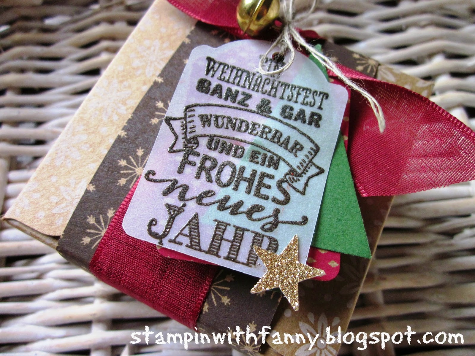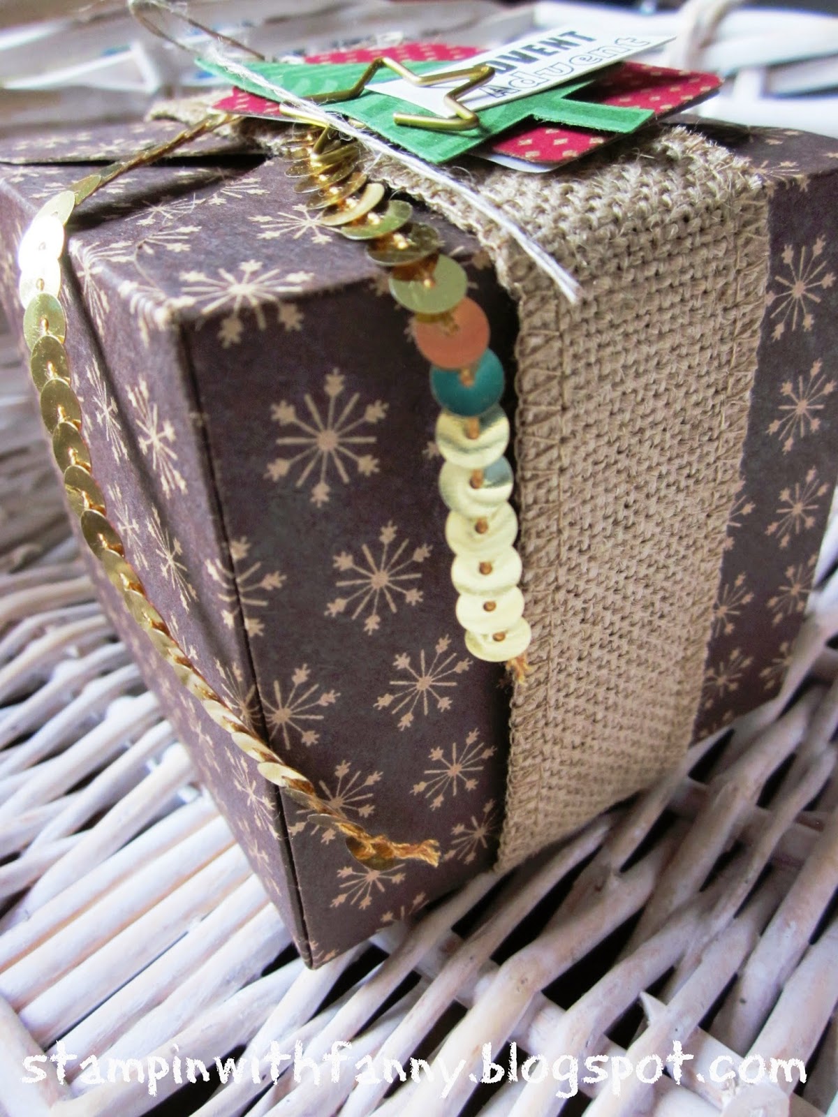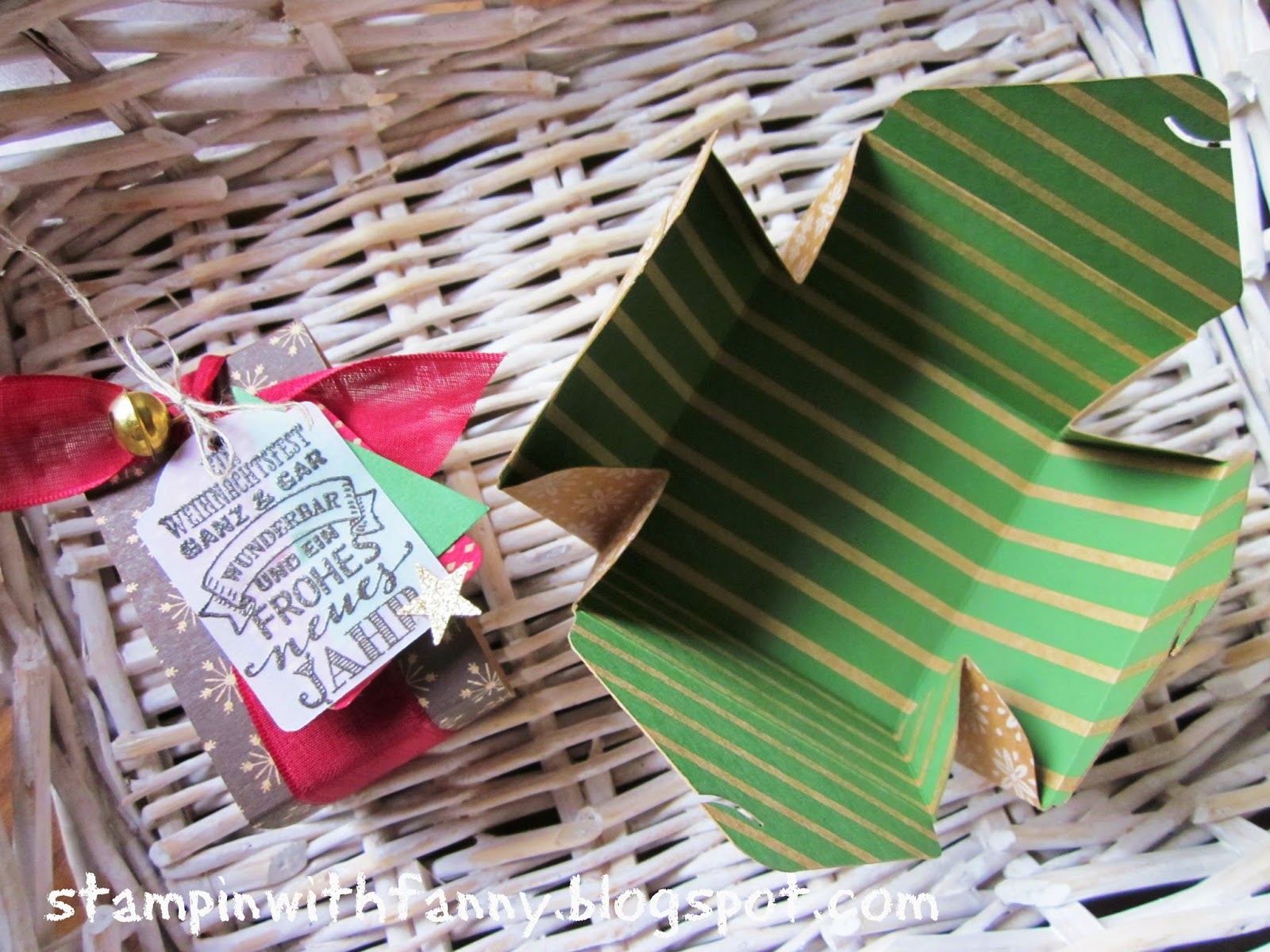 Bei der dritten Box hab ich das Juteband als Manchette benutzt, unten einfach mit unserem Stampin' Up! Tacker zusammengetackert. Hält Bombe! Dann noch ein bisschen Paillettenband in Gold, wieder die Tannenbaumstanze und das Etikett, die Farben sind Espresso, Chili, Vanille Pur und Gartengrün.