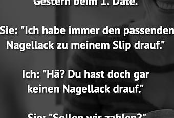 Auf Facebook teilen Vorige Folgende Gestern beim 1. Date. Sie: "Ich habe immer den... Autor des Artikels : istdaslustig Zum Original-Artikel Gestern beim 1. Date. Sie: "Ich habe immer den passenden Nagellack zu meinem Slip drauf." Ich: "Hä? Du hast doch gar keinen Nagellack drauf." Sie: "Sollen wir zahlen?" Hier geht es zum Artikel Mehr Lustiges auf www.istdaslustig.de Auf Facebook teilen Vorige Folgende Das könnte Ihnen gefallen Mehr