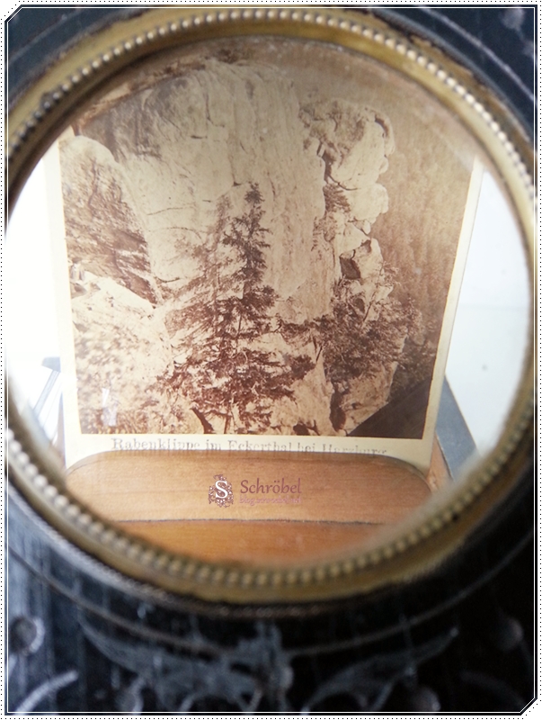 Diesmal habe ich einen kleinen Bildbetrachter gefunden. Es handelt sich um ein schön verziertes Kasterl mit einer großen Lupe vorne in der Mitte. Der Kasten ist nicht sehr groß - vielleicht so in etwa wie eine Tafel Schokolade
