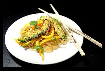 In einer Pfanne Öl erhitzen und die Avocadospalten darin anbraten, bis der Sesam etwas Farbe angenommen hat.