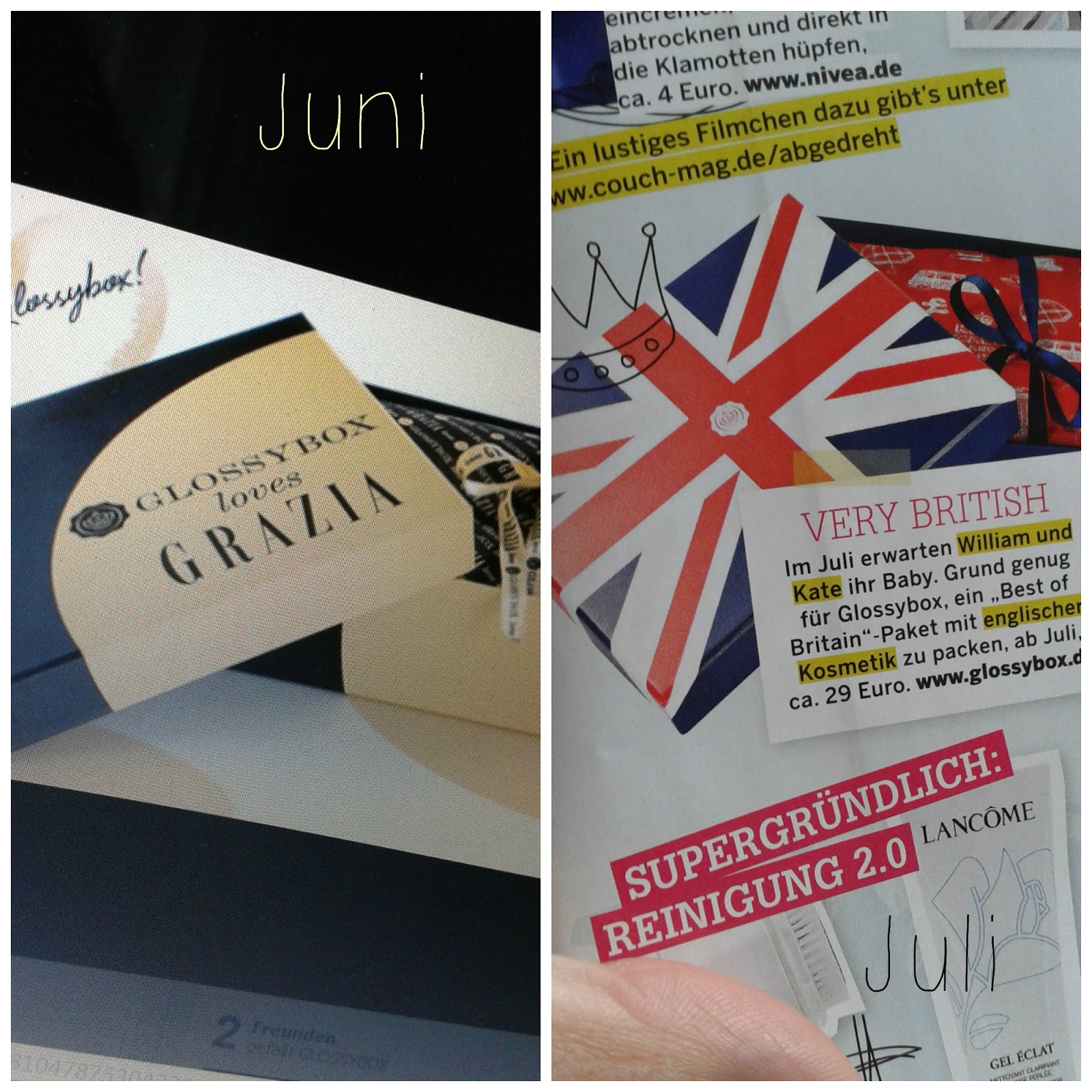 Im JULI wird sich die Glossybox dann ganz dem Thema "Best of Britain" widmen. Anlässlich des Geburtsmonats des royalen Nachwuchses wird diese Box ausschließlich mit britischen Beauty-Produkten gefüllt sein - diese Box wird 29,- € kosten.