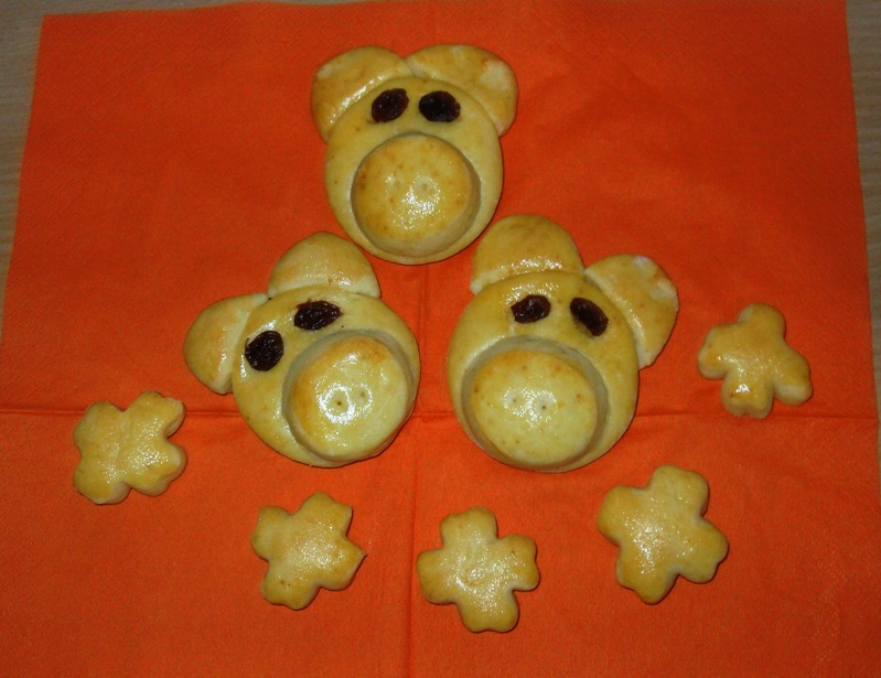 Nach Wunsch evtl. spitz zu ziehen und an den Schweineköpfen befestigen.Rosinen als Augen eindrücken.Alles mit Eigelb bestreichen und in den Ofen schieben.