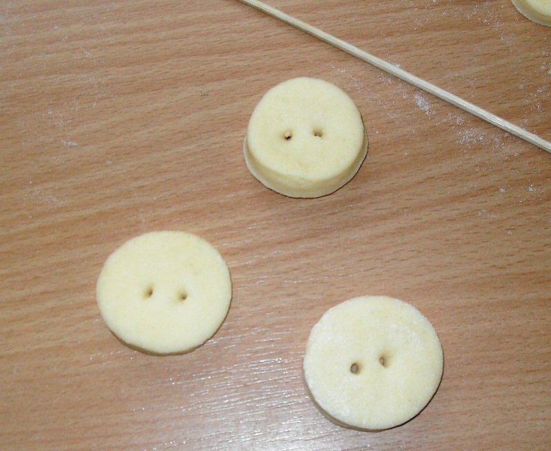 Backofen vorheizen: 175 Grad (Ober-/Unterhitze). Für die Schweinchen werden die großen Kreise aufs Blech gelegt und mit dem Eigelb eingepinselt.Eine Hälfte der kleinen Kreise werden mit Hilfe eines Schaschlikstäbchens oder Zahnstochers mit Löchern versehen für die Rüssel.