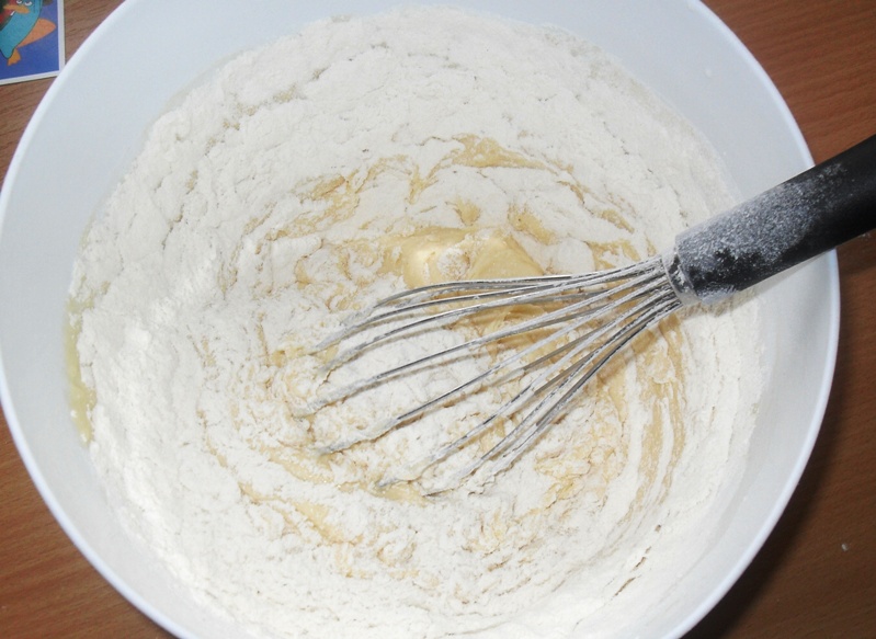 Mehl-Backpulvergemisch portionsweise darüber sieben. Anfangs mit dem Schneebesen unterrühren und wenn der Teig dann fester wird, den Rest mit den Händen unterarbeiten bis ein glatter, nicht mehr klebender Teig entstanden ist. Eventuell noch etwas Mehl zufügen.