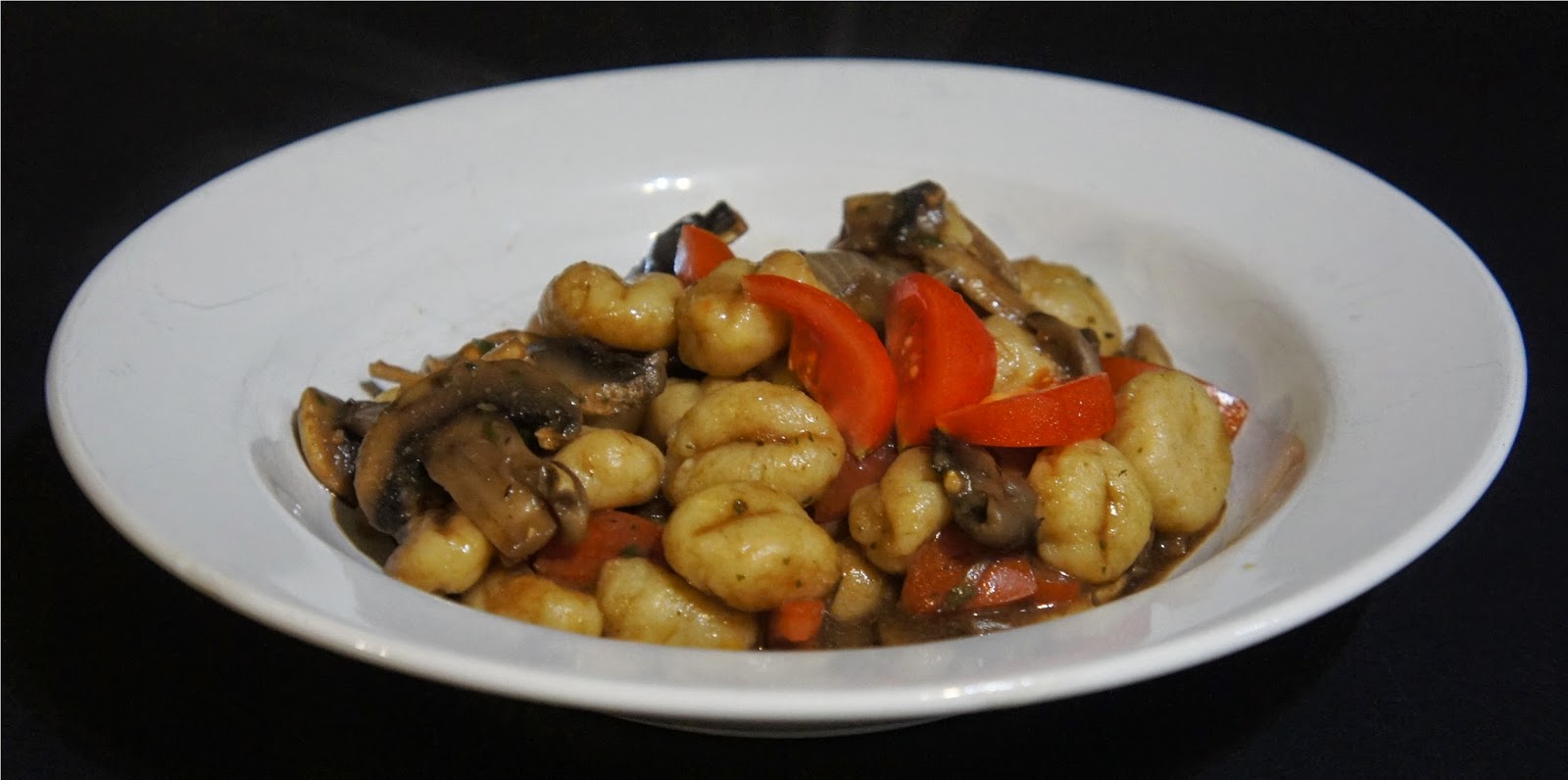 Die Zwiebeln schälen und würfeln, Champignons putzen, in Scheiben schneiden und in der Margarine andünsten, mit Mehl bestäuben. Folgend mit dem Gemüsefond und der Sahne ablöschen und aufkochen lassen. Das Tomatenmark untermischen, folgend mit Salz, Pfeffer, Sojasauce, Balsamico, Kräutern und der gewürfelten Tomate abschmecken.