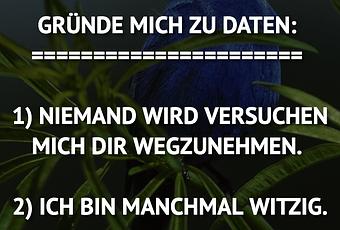 Auf Facebook teilen Vorige Folgende GRÜNDE MICH ZU DATEN: ======================... Autor des Artikels : istdaslustig Zum Original-Artikel GRÜNDE MICH ZU DATEN: ====================== 1) NIEMAND WIRD VERSUCHEN MICH DIR WEGZUNEHMEN. 2) ICH BIN MANCHMAL WITZIG. Hier geht es zum Artikel Mehr Lustiges auf www.istdaslustig.de Auf Facebook teilen Vorige Folgende Das könnte Ihnen gefallen Mehr