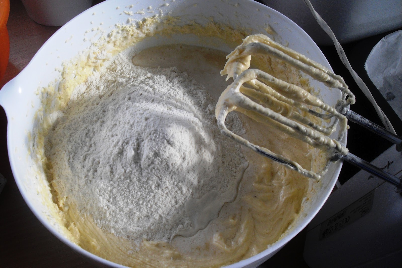 Das Mehl mit dem Backpulver mischen und im Wechsel mit der Flüssigkeit in 2 Portionen unter den Teig rühren.