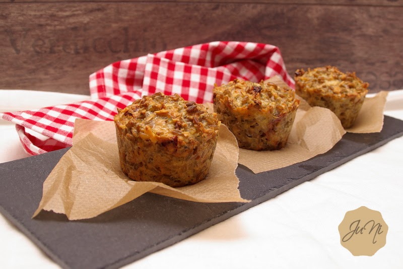 Zubereitung:Den Grünkern in Salzwasser oder Brühe aufkochen und ca. 30 Minuten köcheln lassen. Dann in einem Sieb abgießen. In der Zwischenzeit die Zwiebel würfeln und zusammen mit den Haferflocken kurz in einer Pfanne in etwas Öl anschwitzen. Wenn alles etwas abgekühlt ist, den Grünkern, die Haferflocken und die Zwiebelwürfel mit den geriebenen Mandeln, den Gewürzen, den klein geschnittenen getrockneten Tomaten und dem geriebenen Käse gut vermischen. Die Eier verquirlen und ebenfalls gut mit den restlichen Zutaten vermischen. Die Muffinform etwas einfetten und die Masse in die Mulden verteilen, dabei gut andrücken. Für ca. 30 Minuten bei 180° Grad im vorgeheizten Backofen backen.