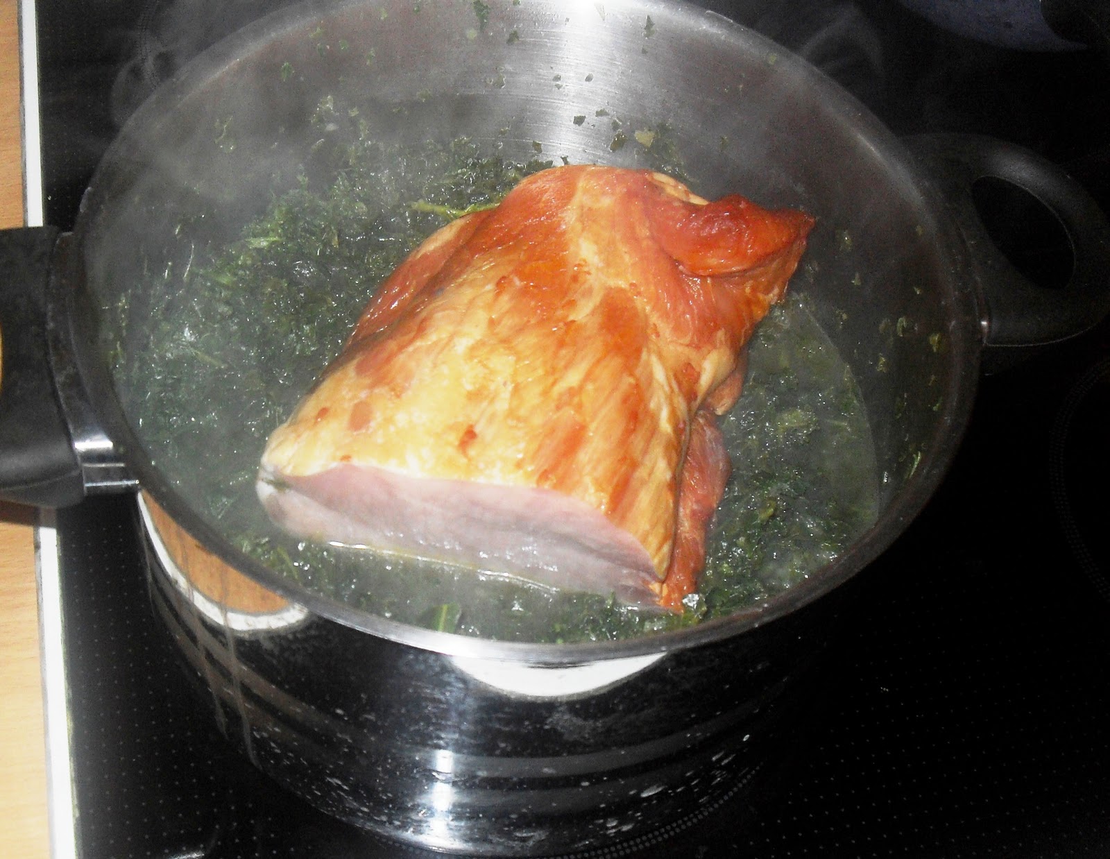 Die gedünstete Zwiebel gab ich dann zu dem Grünkohl und rührte sie unter. Dann noch das Stück Kasselerbraten obenauf gesetzt, Deckel drauf und bei kleiner Hitze (Stufe 1) für gut 60 Minuten köcheln lassen.