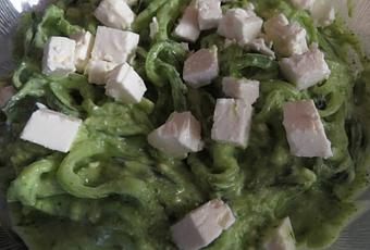 Die Gurke (mit Schale) mit einem Spiralschneider zu „Gemüse-Spaghetti“ verarbeiten.