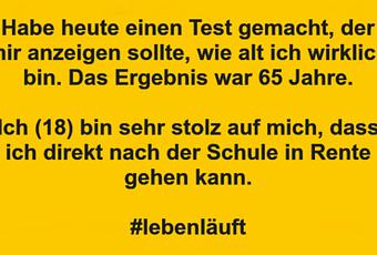 Auf Facebook teilen Vorige Folgende Habe heute einen Test gemacht, der mir anzeigen... Autor des Artikels : istdaslustig Zum Original-Artikel Habe heute einen Test gemacht, der mir anzeigen sollte, wie alt ich wirklich bin. Das Ergebnis war 65 Jahre. Ich (18) bin sehr stolz auf mich, dass ich direkt nach der Schule in Rente gehen kann. #lebenläuft Hier geht es zum Artikel Mehr Lustiges auf www.istdaslustig.de Auf Facebook teilen Vorige Folgende Das könnte Ihnen gefallen Mehr