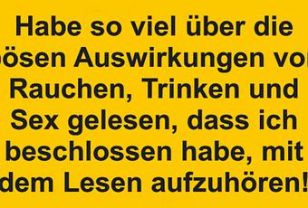 Auf Facebook teilen Vorige Folgende Habe so viel über die bösen Auswirkungen von... Autor des Artikels : istdaslustig Zum Original-Artikel Habe so viel über die bösen Auswirkungen von Rauchen, Trinken und Sex gelesen, dass ich beschlossen habe, mit dem Lesen aufzuhören! Hier geht es zum Artikel Mehr Lustiges auf www.istdaslustig.de Auf Facebook teilen Vorige Folgende Das könnte Ihnen gefallen Mehr