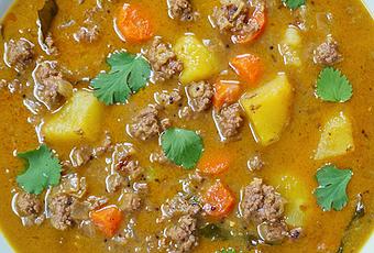 Das Hackfleisch und die in Würfel geschnittenen Zwiebeln leicht anbraten. Die Möhren und die Kartoffeln schälen, in kleine Würfel schneiden und dazugeben. Mit der Brühe aufgießen und 45 Minuten köcheln lassen.