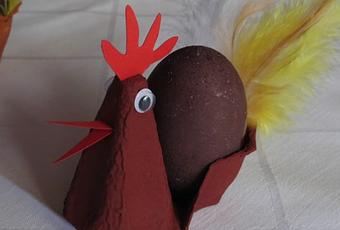 Aus rotem Tonkarton einen „Schnabel“ und einen „Kamm“ ausschneiden. Mit dem Cutter einen kleinen Schlitz an der Stelle, wo Schnabel bzw. Kamm befestigt werden sollen, in den Karton schneiden. Kamm und Schnabel am hinteren/unteren Ende mit etwas Kleber einstreichen und die Teile in die entsprechenden Schlitze stecken.