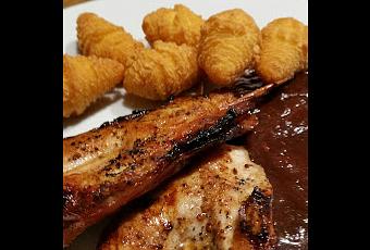 - restliches Butterschmalz in einer Pfanne erhitzen und die Spieße zuerst mit der belegten Seite von allen Seiten 2-3 Minuten braten und mit der Soße servieren