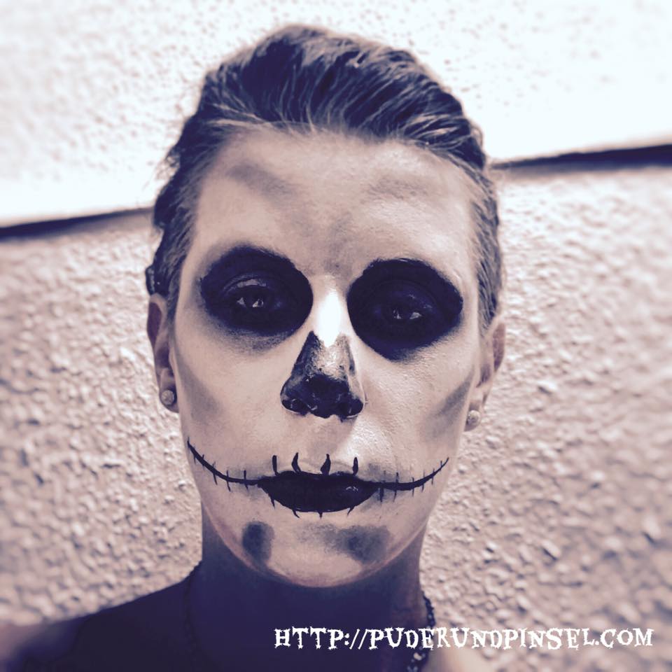 Mit weißer Theaterfarbe, ein bisschen dunkelgrauem Lidschatten und etwas Kajal kann man sich in Sekunden in ein Skelett verwandeln.Die Haare habe ich Streng nach Hinten gesteckt und ebenfalls weiß angesprüht.