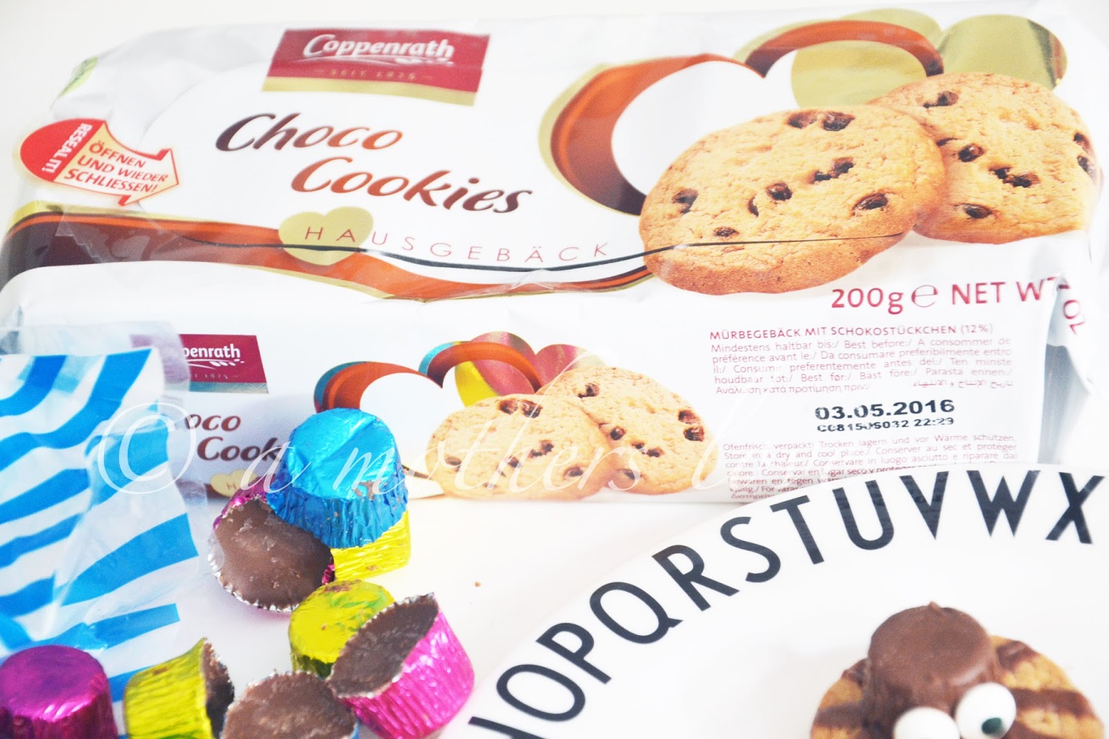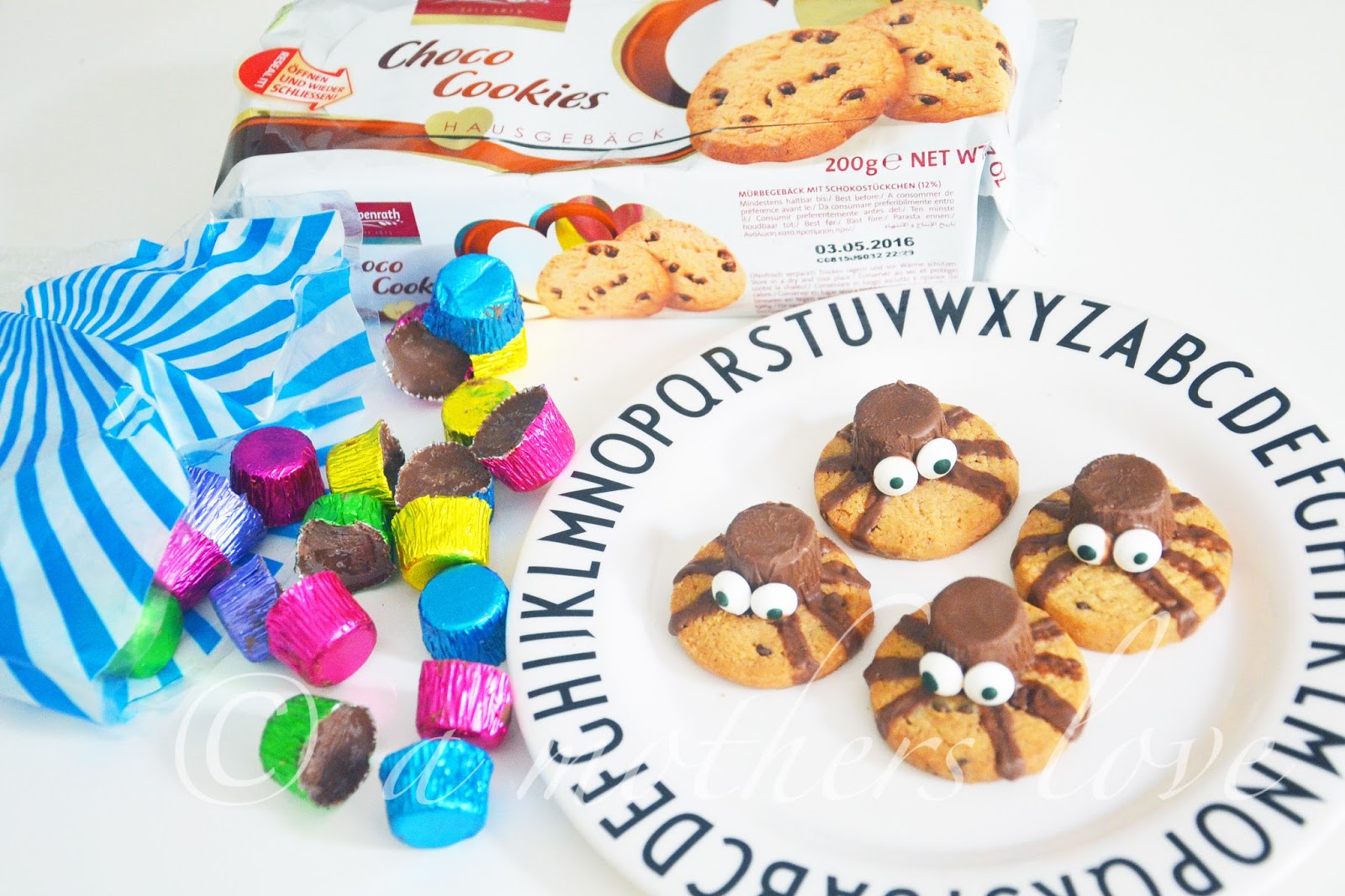 Hier haben wir einen schnellen Halloween-Tipp für euch. Alles was ihr dafür benötigt sind Kekse. Diese könnt ihr auch gerne selber backen, dass ist euch überlassen. Oder gekaufte wie in unserem Fall wenn es mal zackig gehen soll =) Schokoladen Konfekt, dass wird nämlich der Rücken unserer Spinnen und zuletzt Zuckeraugen. Diese benutze ich übrigens auch für unsere Bentoboxen welche ihr hier findet.