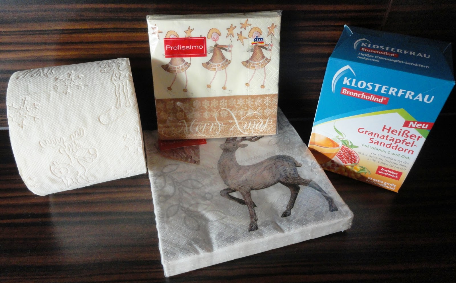 Winterservietten müssen einfach sein, da hab ich immer was passendes daheim. Das Klosterfrau-Getränkepulver ist sehr lecker. Hatte von der DM-Drogerie mal eine Probe dazu und war begeistert vom Geschmack. Soll dazu noch die Abwehrkräfte stärken - super, kommt mit!