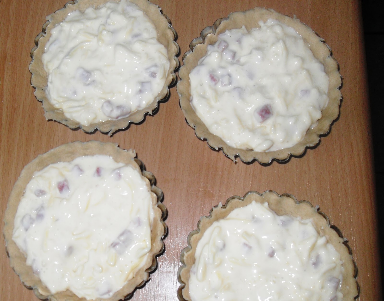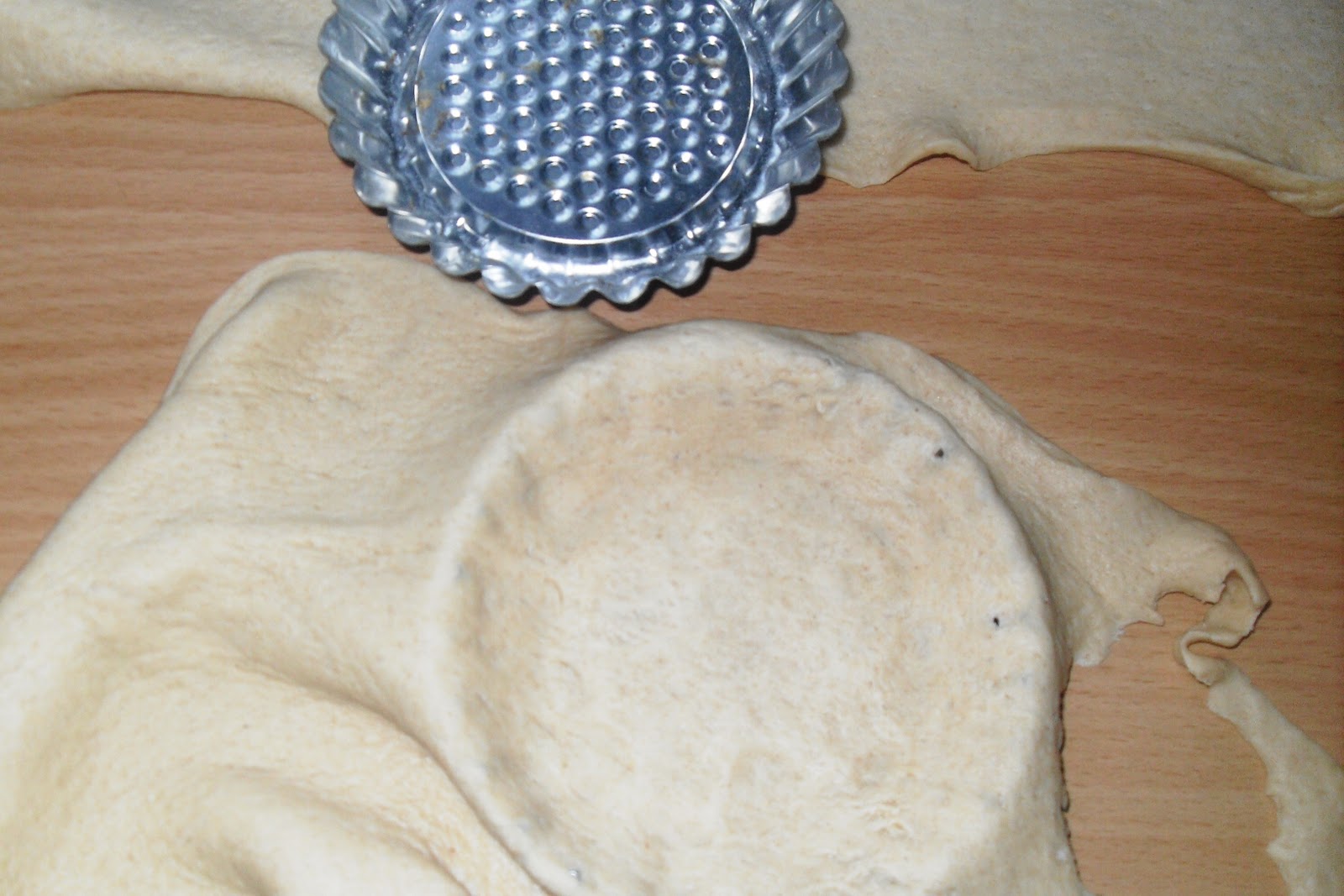 Tortelett Förmchen (Teig reicht für ca. 10 Stück) nach Bedarf fetten und evtl. mehlen (bei meinen Förmchen unnötig) und mit dem Teig auskleiden.