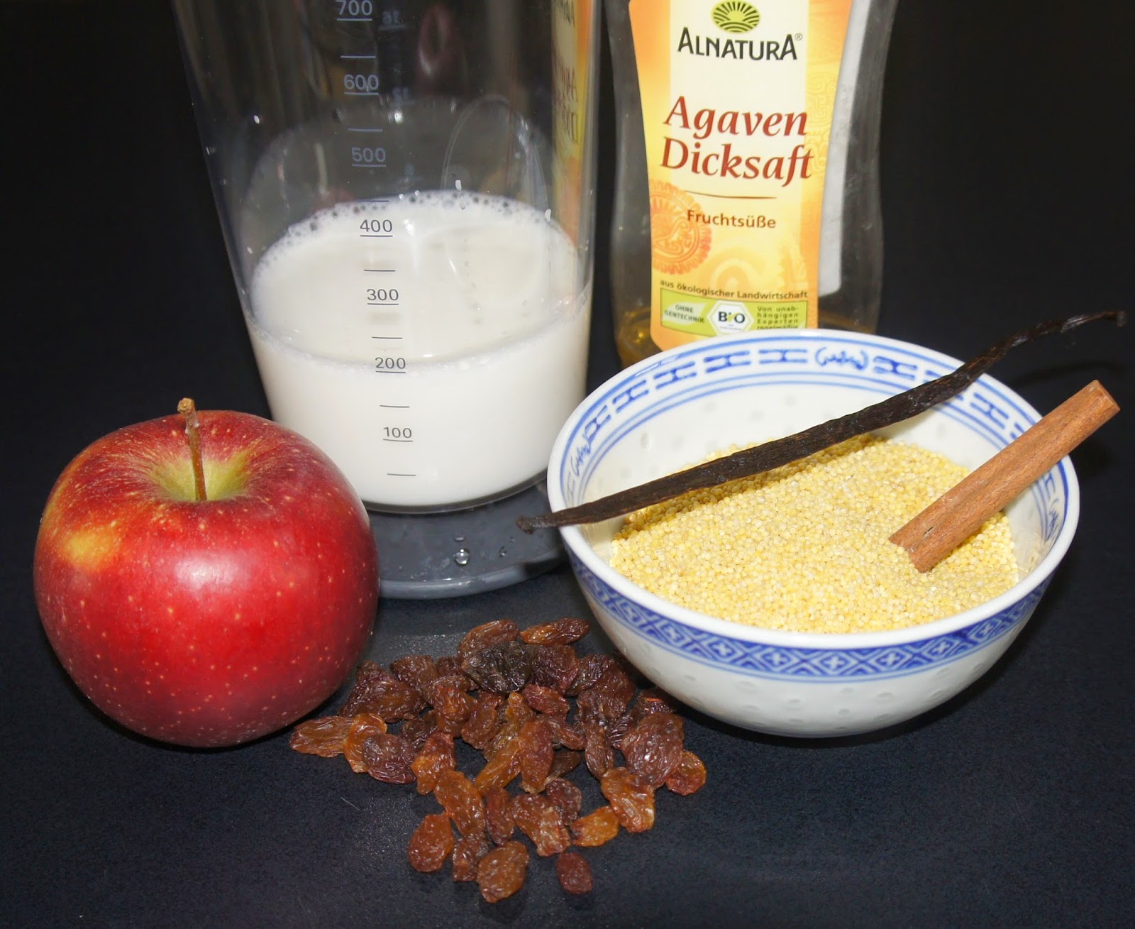 Mandeldrink zusammen mit dem Mark der Vanilleschote, Agavendicksaft und der Zimstange aufkochen, die Hirseeinrühren und sanft 5 Minuten Kochen lassen, danach den Herd ausstellen, Rosinen dazugeben und die Hirse nur noch quellen lassen.Variante 1: Gefüllte Äpfel Den Deckel der Äpfel großzügig abschneiden, das Kerngehäuse entfernen und den Apfel großzügig aushöhlen. Danach mit der gegarten Hirse füllen. Entweder so anrichten oder die gefüllten Äpfel bei 180 Grad ca. 15 Minuten in den Backofen geben, sodass die Äpfel weich werden.Variante 2: Überbacken