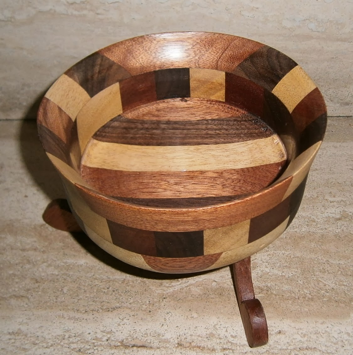 Er hat also gedrechselt, mehrfarbig, aus Abachi, Nussbaum und Mahagoni, die er zuvor aufeinandergeleimt hat.Die erste Schale ist meine, ohne Füße, weil ich das lieber mag. "Ganz einfach", nur 3 Schichten übereinander, 22cm Durchmesser und 10 cm hoch.