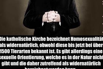 Wer mich kennt, weiß darum, dass ich keinerlei Affinität zur katholischen Kirche besitze. Doch sollten auch andere die Kirche im Dorf belassen. Seit wann gibt es in einem Land, in dem angeblich die Freiheit ganz groß geschrieben wird, die Pflicht bzw. den Zwang, Homosexualität als das zu betrachten, wie es von einer geltungssüchtigen Minderheit befohlen wird?