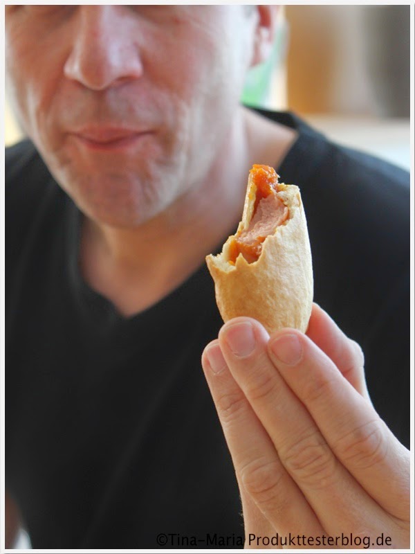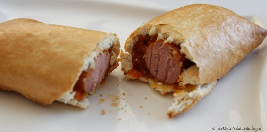 Als erstes haben wir uns die "Ruhrpott Style" Version vorgenommen. Hierbei handelt es sich um eine weiße Bratwurst die mit Currysauce in ein Brötchenteig umhüllt ist. Diese kann man nun in der Mikrowelle (2 Min bei 600 Watt) oder wie wir es versucht haben, im Backofen bei 150 Grad und 20 Minuten zubereiten. Mein Mann und unsere Kinder waren sehr gespannt. Jedes der eingehüllten Würstchen hat im übrigen ein Gewicht von 120 g und so ein Snack hat übrigens a´ 288 kcl und man zahlt für eine Packung (Inhalt 2 Stück) 1,99€.