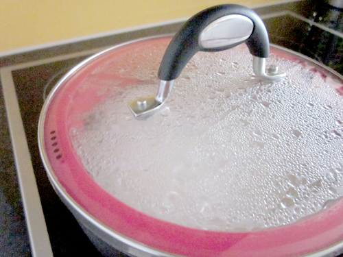 Zuerst wäscht ihr den Reis gründlich mit Hilfe eines Siebes. Danach wird er gekocht: Dazu Wasser und Reis auf höchster Stufe zum kochen bringen und gedeckt ca. 10-15 Minuten kochen lassen bis das Wasser "verschwunden" ist. Da wir gerne übertreiben haben wir die ganze Packung, also 500 g Reis, reingeworfen. Empfohlen wird jedoch: 300g Reis auf 330 ml Wasser