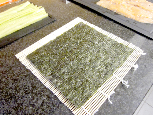 Nun zum Hauptteil: Auf eine Sushimatte (im Asiashop oder auch in den meisten Supermärkten erhältlich) lege ich ein Blatt Sushi Nori mit der glatten Seite nach unten. Falls ihr kleinere Rollen machen wollt, könnt ihr das Blatt auch gerne längs halbieren.