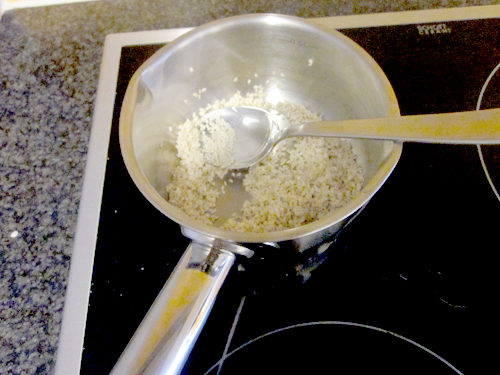 Beim Ura Maki geht man genau gleich vor wie beim Futo Maki: Man kocht den Reis sowie das Reiswasser und schneidet die gewünschten Zutaten zurecht. Gleichzeitig bereitet man hier jedoch noch den Sesam vor. Dafür diesen ganz leicht anbraten, damit er nicht so gummig ist.