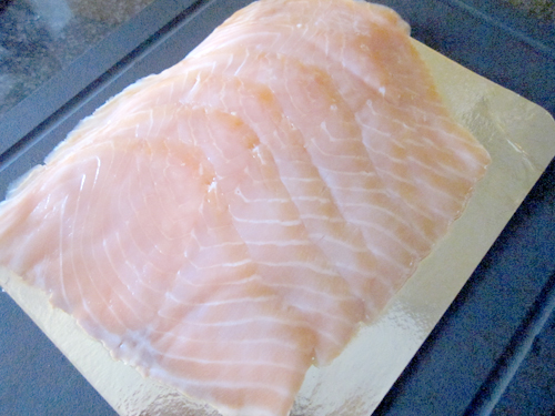 Ich habe drei verschiedene Sushis gemacht, einmal Futo Maki (grosse Rolle) mit Gurken; Frischkäse und Lachs, einmal Ura Maki mit Sesam drumherum und einmal, nur mit Lachs und Reis. Aber seht selbst!
