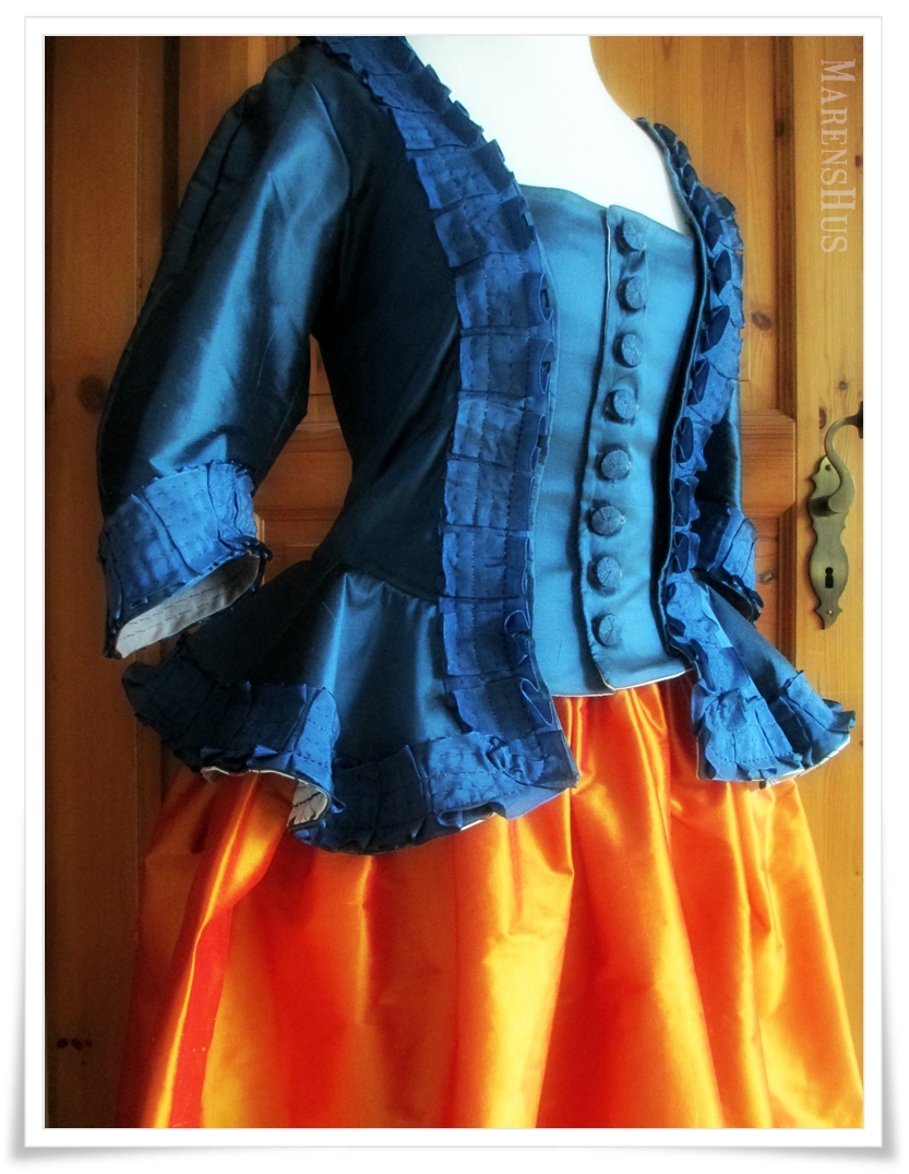 Die blaue Seide war mal ein Reststück, in die Farbe habe ich mich sofort verliebt, die Jacke im Groben war auch schon ewig zugeschnitten, aber mit dem "Feintuning" war ich irgendwie gedanklich noch nicht fertig, bis mir die Knopfwickelei (am Stecker sind selbstgewickelte Posamentknöpfe) und ein Stück passendes blaues Seidenband dazu kamen. Weil ich dazu nicht immer den cremeweißen Rock aus dem privaten Fundus tragen wollte, entschied ich mich noch, diesen Rock-Sonnenschein in orange dazu zu nähen. Dem Thema entsprechend gefaltet wurde an beiden Stücken - sowohl am Rocksaum, als auch an den 10m Seidenband, das die Rüsche an der Jacke bildet. Tragebilder gibts aktuell noch keine, deshalb heute nur auf der Puppe: