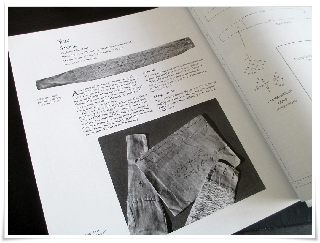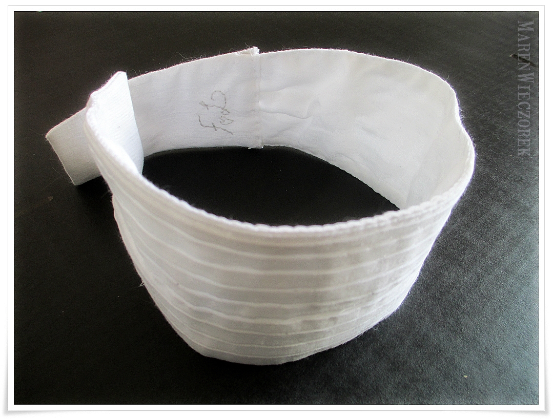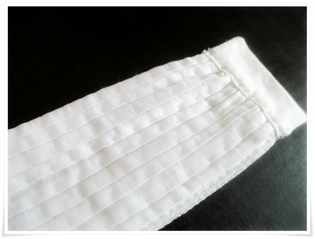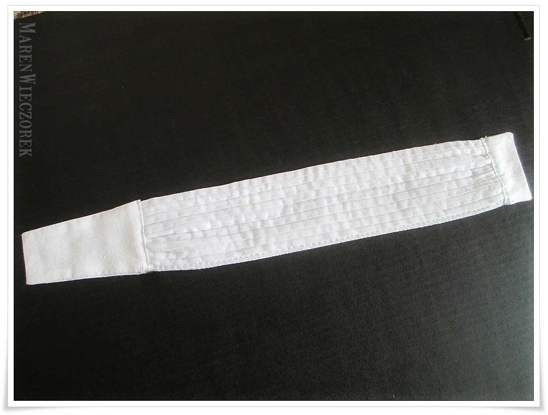 Wie im Original besteht die Halsbinde aus einem Teil gefalteten Stoffes, einem Rückenteil und einer Lage Zwischenfutter, auf dem die Falten mit kleinen Stichen fixiert sind.... ich meine, das sind sie so im Original nicht, zumindest habe ich es der Abbildung nicht entnehmen können, halte es aber für sinnvoll, damit es nach dem Waschen besser wieder in die Ausgangsform zurückgeht.