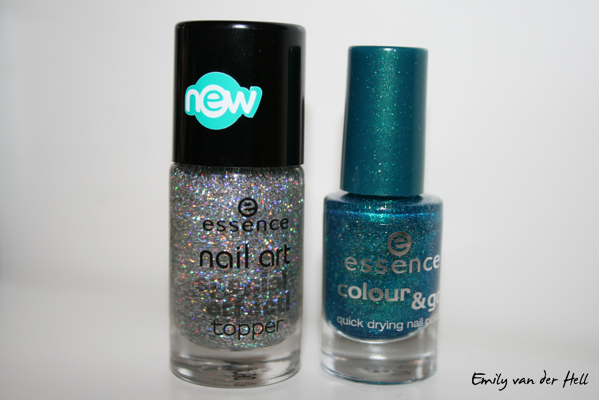 Auf schwarzen Lack habe ich mit einem Wattestäbchen zuerst einen grünlichen Lack auf Teile des Nagels getupft, danach einen Fuchsiaton. Darüber pinselte ich erst einen bläulichen Glitterlack und dann einen silbernen Holotopper. Ich habe folgende Lacke/Farben benutzt: schwarz (incolor by Jordana), I sea you (Catrice), einen Fuchsiaton (?) von Manhattan, Last Friday Night (OPI) und Hallo Holo! (essence). Mein Topcoat ist der Top-Sealer (better than Gelnails) von essence.