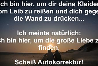 Auf Facebook teilen Vorige Folgende Ich bin hier, um dir deine Kleider vom Leib zu... Autor des Artikels : istdaslustig Zum Original-Artikel Ich bin hier, um dir deine Kleider vom Leib zu reißen und dich gegen die Wand zu drücken... Ich meinte natürlich: Ich bin hier, um die große Liebe zu finden. Scheiß Autokorrektur! Hier geht es zum Artikel Mehr Lustiges auf www.istdaslustig.de Auf Facebook teilen Vorige Folgende Das könnte Ihnen gefallen Mehr