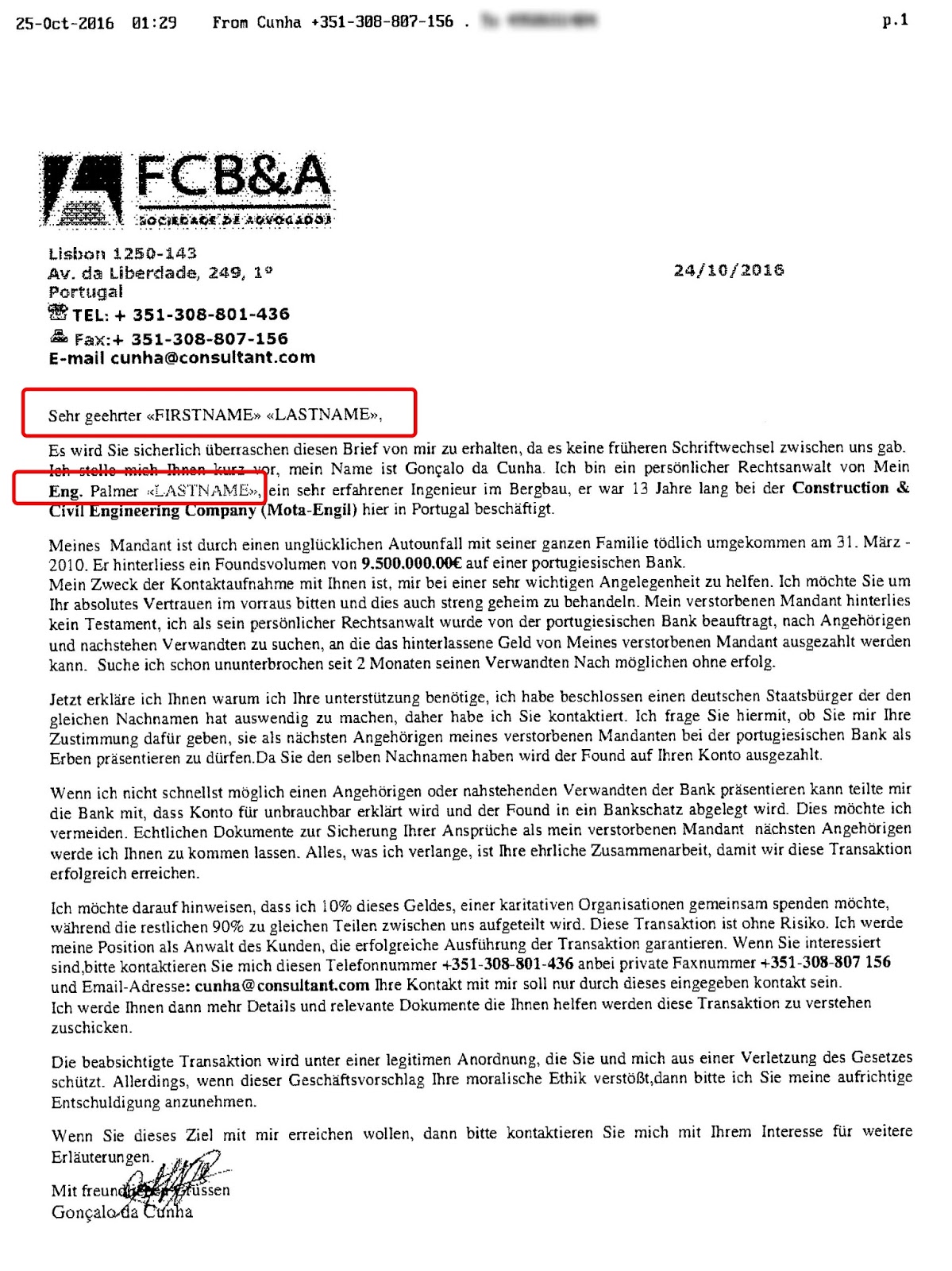Es ist für mich immer wieder erstaunlich wie dämlich manche Betrüger vorgehen und dass sie anscheinend trotzdem damit Erfolg haben, denn sonst würden die das wohl nicht machen.Gestern habe ich sogar ein Fax bekommen, dass ein Verwandter von mir (er trägt den selben Nachnamen) mir 9.5. Mio vererben will.Dumm nur, dass das Programm den Platzhalter nicht ersetzt hat!