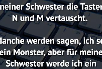 Auf Facebook teilen Vorige Folgende Ich habe auf der Tastatur meiner Schwester die... Autor des Artikels : istdaslustig Zum Original-Artikel Ich habe auf der Tastatur meiner Schwester die Tasten N und M vertauscht. Manche werden sagen, ich sei ein Monster, aber für meine Schwester werde ich ein Nomster sein! Hier geht es zum Artikel Mehr Lustiges auf www.istdaslustig.de Auf Facebook teilen Vorige Folgende Das könnte Ihnen gefallen Mehr
