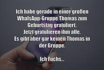 Auf Facebook teilen Vorige Folgende Ich habe gerade in einer großen WhalsApp-Gruppe... Autor des Artikels : istdaslustig Zum Original-Artikel Ich habe gerade in einer großen WhalsApp-Gruppe Thomas zum Geburtstag gratuliert. Jetzt gratulieren ihm alle. Es gibt aber gar keinen Thomas in der Gruppe. Ich Fuchs... Hier geht es zum Artikel Mehr Lustiges auf www.istdaslustig.de Auf Facebook teilen Vorige Folgende Das könnte Ihnen gefallen Mehr