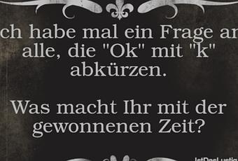 Auf Facebook teilen Vorige Folgende Ich habe mal ein Frage an alle, die "Ok" mit... Autor des Artikels : istdaslustig Zum Original-Artikel Ich habe mal ein Frage an alle, die "Ok" mit "k" abkürzen. Was macht Ihr mit der gewonnenen Zeit? Hier geht es zum Artikel Mehr Lustiges auf www.istdaslustig.de Auf Facebook teilen Vorige Folgende Das könnte Ihnen gefallen Mehr