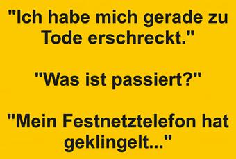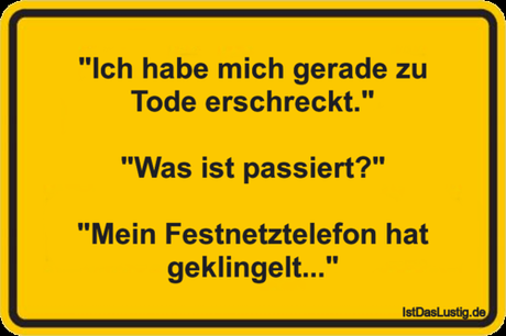 Auf Facebook teilen Vorige Folgende "Ich habe mich gerade zu Tode erschreckt."... Autor des Artikels : istdaslustig Zum Original-Artikel "Ich habe mich gerade zu Tode erschreckt." "Was ist passiert?" "Mein Festnetztelefon hat geklingelt..." Hier geht es zum Artikel Mehr Lustiges auf www.istdaslustig.de Auf Facebook teilen Vorige Folgende Das könnte Ihnen gefallen Mehr