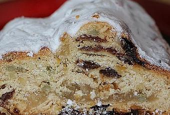 Mehl, Zucker, Backpulver, Eier, Butter, Nüsse, Mandeln, Zitronat, Orangeat, Sultaninen, Lebkuchengewürz und Quark zu einem Teig kneten. Teig ausrollen, Marzipan rollen und in die Teigmitte geben und zu einem Stollen formen. Stollen auf ein mit Backpapier ausgelegtes Blech geben und bei 175 Grad ca. 70 Min. backen, dann sofort mit flüssiger Butter bestreichen und dick mit Puderzucker bestäuben.
