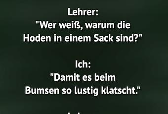 Auf Facebook teilen Vorige Folgende Im Biologieunterricht Lehrer: "Wer weiß, warum... Autor des Artikels : istdaslustig Zum Original-Artikel Im Biologieunterricht Lehrer: "Wer weiß, warum die Hoden in einem Sack sind?" Ich: "Damit es beim Bumsen so lustig klatscht." Lehrer: "Raaaauuus!" Hier geht es zum Artikel Mehr Lustiges auf www.istdaslustig.de Auf Facebook teilen Vorige Folgende Das könnte Ihnen gefallen Mehr