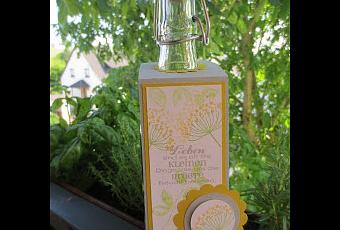 für ein selbstgemachtes Geschenk,wie dieser?Ein Grund für mich für das Set"Alles nur Sprüche"Bei meinem Workshop kam es dann auch,zusammen mit dem Set " Sommer Silhouettes"und der genialen FarbkombiMango und Schiefergraufür eine Flaschenkarte zum Einsatz.