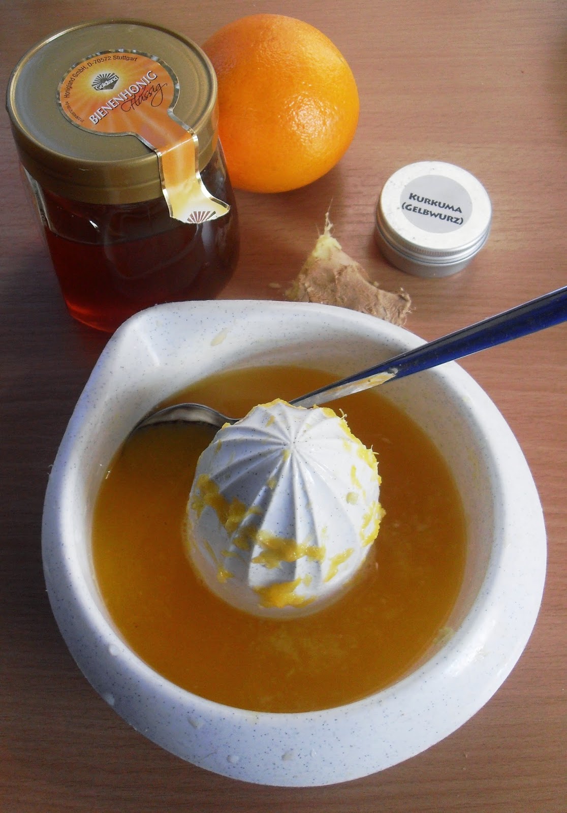 Da meine "Männer" hier nicht so auf das Fruchtfleisch stehen, siebe ich den Saft noch vor dem Servieren durch ein Haarsieb - dann lässt er sich auch einfach er trinken ;-)Anmerkungen:- wozu das ganze? Ganz einfach...durch Zufall entdeckte ich bereits vor einiger Zeit im Netz diese kurze Anleitung und dieses Getränk soll der Stärkung des Immunsystems dienen. Bei der aktuellen Jahreszeit und dem schwankenden Wetter also perfekt!Außerdem habe ich gerade zwei Kranke hier und es kann sicher nicht schaden, wenn ich sie mit einer Extraportion Vitamine & natürlicher Wirkstoffe versorge :-)- dieser Drink ist also ein Getränk, dessen positive Wirkstoffe für die ganze Familie geeignet sind. Täglich ein Gläschen soll vorbeugend helfen. Vielleicht probiere ich es auch die Tage noch mal zusätzlich mit etwas Zitronensaft- meine Kinder finden den Saft lecker, mein Mann dagegen etwas sehr süß, wobei man natürlich auch dazu sagen muss, das ich die Honigmenge ohnehin schon halbiert habe. Allerdings darf man ja auch dabei erwähnen, das der Honig auch wirken soll, daher würde ich die Menge nicht noch weiter herunter setzen- ob es wirklich etwas bringen wird...wir werden sehen :-) Schaden kann es auf jeden Fall nicht!- hier noch ein paar Angaben zu den Zutaten:Orangen:- großartiger Vitamin C Lieferant, dieses Vitamin ist auch ein Antioxidationsmittel, das freie Radikale im Blut, im Gehirn, in Körperzellen und auch direkt im Zellkern abfängt- dient dem Gefässschutz, in dem es die Innenwände der Arterien glatt hält. Folge: Cholesterin kann sich nicht absetzen!- kräftigt das Bindegewebe- verbessert Kalzium- und Eisenaufnahme- reguliert Hormonausschüttung- aktiviert Enzyme in der Leber, so das Giftstoffe besser abgebaut werden können- es regt die Fettverbrennung in der Muskulatur an- erhöht die Konzentrationsfähigkeit & Reaktionsbereitschaft und noch viel mehrHonig:- wirkt leicht entzündungshemmend- fördert die WundheilungKurkuma:- starkes Antioxidantsmittel, das bevorzugt bei Erkrankungen wie Arthritis eingesetzt wird (wirkt Gelenkentzündungen entgegen)- verhindert die Oxidation von Cholesterin, das im oxidierten Zustand die Blutgefässe schädigt- Vitamine B6: in Zusammenwirkung mit Vitamin B12 und Folsäure wird der Homocysteinspiegel nicht erhöht, so das es auch hier nicht zu einer Schädigung der Gefässwände kommen kannIngwer:- entzündungshemmende und schmerzstillende Eigenschaften- verringert Übelkeit- löst Husten und Magen-Darm-Beschwerden