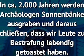 Auf Facebook teilen Vorige Folgende In ca. 2.000 Jahren werden Archäologen... Autor des Artikels : istdaslustig Zum Original-Artikel In ca. 2.000 Jahren werden Archäologen Sonnenbänke ausgraben und daraus schließen, dass wir Leute zur Bestrafung lebendig getoastet haben. Hier geht es zum Artikel Mehr Lustiges auf www.istdaslustig.de Auf Facebook teilen Vorige Folgende Das könnte Ihnen gefallen Mehr