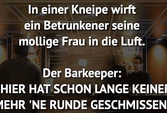 Auf Facebook teilen Vorige Folgende In einer Kneipe wirft ein Betrunkener seine... Autor des Artikels : istdaslustig Zum Original-Artikel In einer Kneipe wirft ein Betrunkener seine mollige Frau in die Luft. Der Barkeeper: "HIER HAT SCHON LANGE KEINER MEHR 'NE RUNDE GESCHMISSEN." Hier geht es zum Artikel Mehr Lustiges auf www.istdaslustig.de Auf Facebook teilen Vorige Folgende Das könnte Ihnen gefallen Mehr