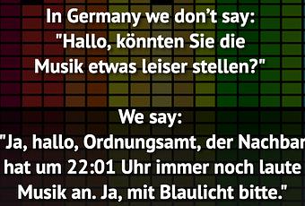 Auf Facebook teilen Vorige Folgende In Germany we don’t say: "Hallo, könnten Sie... Autor des Artikels : istdaslustig Zum Original-Artikel In Germany we don’t say: "Hallo, könnten Sie die Musik etwas leiser stellen?" We say: "Ja, hallo, Ordnungsamt, der Nachbar hat um 22:01 Uhr immer noch laute Musik an. Ja, mit Blaulicht bitte." Hier geht es zum Artikel Mehr Lustiges auf www.istdaslustig.de Auf Facebook teilen Vorige Folgende Das könnte Ihnen gefallen Mehr